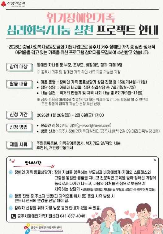 한방통신사 신태공 기자 | 공주시 장애인가족지원센터는 2026년 충남사회복지공동모금회 지원을 받아 ‘위기 장애인가족 심리회복 및 나눔 실천 프로젝트’ 참여자를 모집한다고 26일 밝혔다.