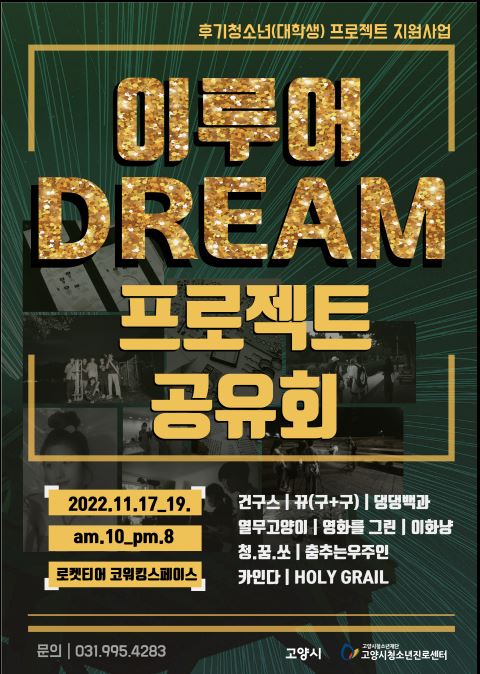 고양시청소년재단 고양시청소년진로센터에서는 후기청소년(대학생)들의 꿈⋅도전⋅성장을 지원하는 「이루어DREAM」 프로젝트가 종료됨에 따라 11월 17일부터 19일까지 3일간 프로젝트 결과를 라페스타 B동 4층 로켓티어에 전시하여 지역사회에 공유한다.「이루어DREAM」은 후기청소년들이 자신들의 진로와 관련된 프로젝트에 대한 기획·운영·평가의 전 과정을 경험하며 구체적인 진로를 설계하고 성장할 수 있는 기회를 제공하기 위한 프로젝트로서, 올해에는 어플개발, 상품제작, 문화예술, 미래기술 4개 분야의 10개 팀이 8개월간 프로젝트를 진행하였다.