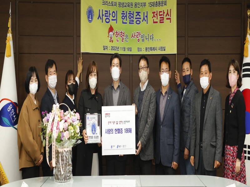 크리스토퍼 평생교육원 용인지부 총동문회는 지난 2020년부터 ‘사랑의 헌혈릴레이 챌린지’를 진행하고 있으며, 올해도 회원들의 적극적인 참여로 186장의 헌혈증을 모았다. 지난해에도 헌혈증 169장을 모아 시에 기부했다.