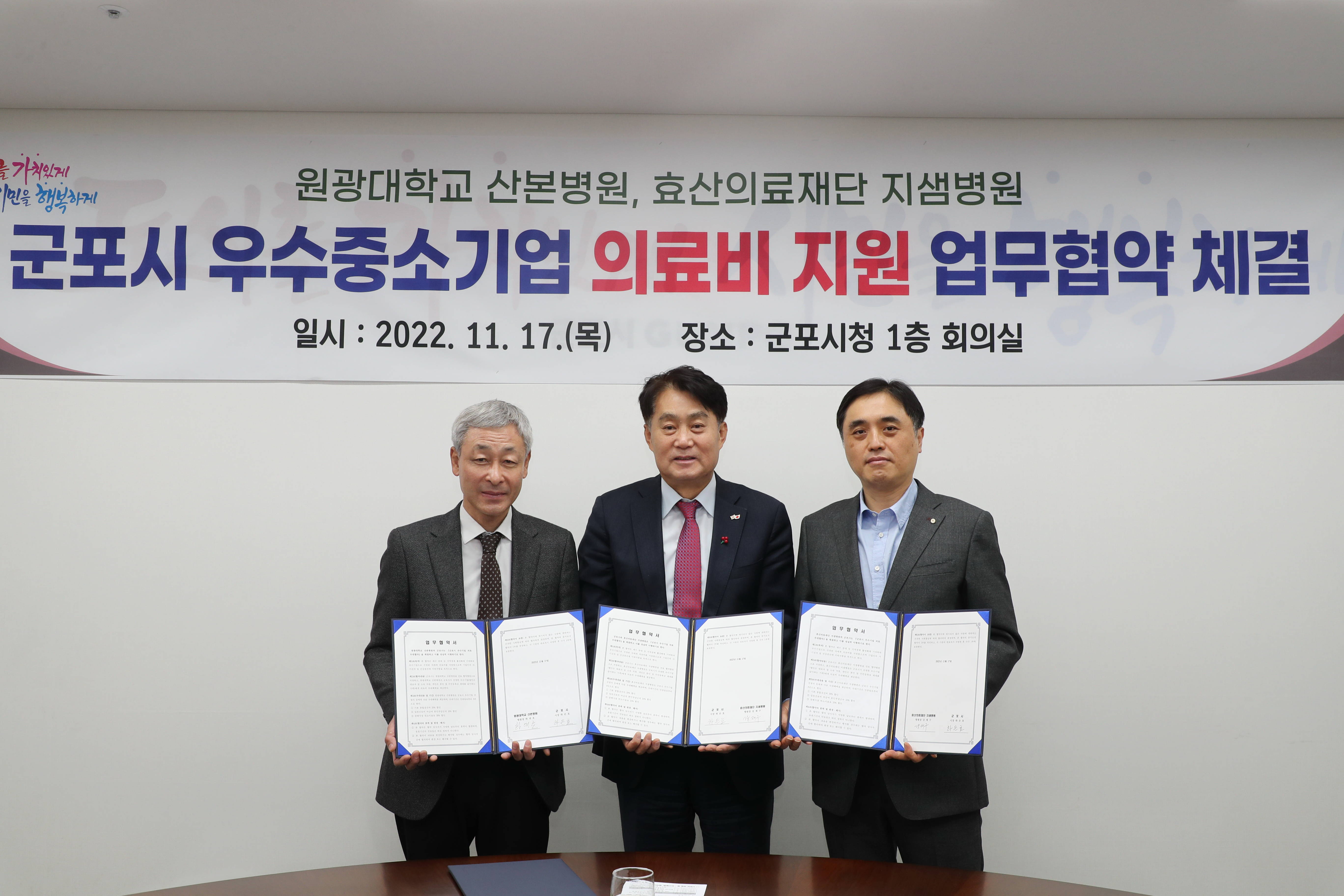 군포시는 우수중소기업으로 선정된 기업 직원들에게 의료비 우대혜택을 제공하기 위해 11월 17일 원광대학교 산본병원(병원장 하대호), 효산의료재단 지샘병원(병원장 강제구)과 의료비 지원 업무협약을 체결했다.