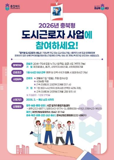 한방통신사 권영분기자 기자 | 충북도가 도내 기업과 소상공인의 구인난 해소와 유휴 인력의 경제활동 참여를 위한 ‘2026년 충북형 도시근로자 지원사업’을 2월부터 본격 시행한다.