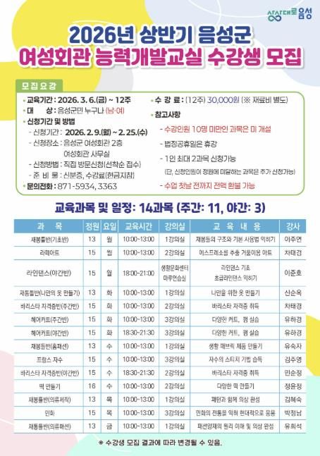 한방통신사 권영분기자 기자 | 음성군은 2026년 상반기 여성회관 능력개발교실 수강생을 모집한다.