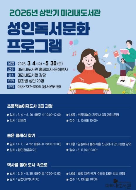 한방통신사 양호선기자 기자 | 원주시 미리내도서관은 시민들의 문화 접근성을 높이기 위해 성인을 대상으로 상반기 독서문화 프로그램을 운영한다.