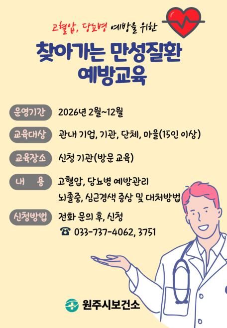한방통신사 양호선기자 기자 | 원주시보건소는 2월부터 12월까지 지역 주민을 대상으로 고혈압·당뇨병 등 만성질환 예방교육을 운영한다.