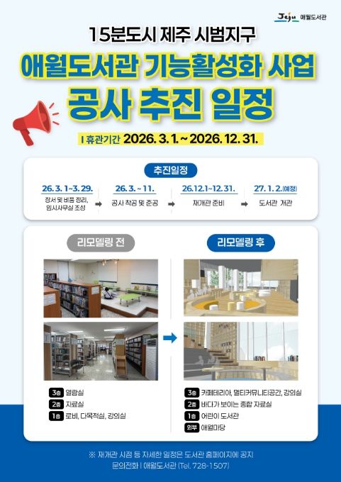 이번 리모델링은 노후 시설을 개선하고 도서관 기능을 강화하기 위해 추진된다. 애월도서관은 공사 기간 중 지역 주민의 독서 접근권을 보장하고 이용 공백을 최소화하고자 애월읍 체육관 2층 다목적실에 임시 자료실을 마련해 임시 서비스를 제공할 방침이다.