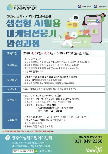 한방통신사 신유철기자 기자 | 양주여성새로일하기센터에서는 오는 3월 4일부터 20일까지 직업교육훈련 과정인 ‘생성형 인공지능(AI)활용 마케팅전문가 양성과정' 교육생을 모집한다.