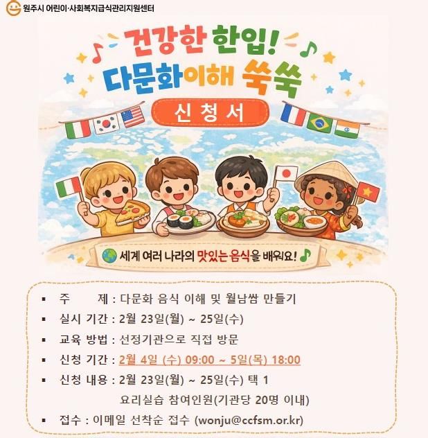 한방통신사 양호선기자 기자 | 원주시어린이·사회복지급식관리지원센터는 오는 23일부터 25일까지 3일간 특화사업인 ‘쑥쑥 요리교실’을 운영한다.