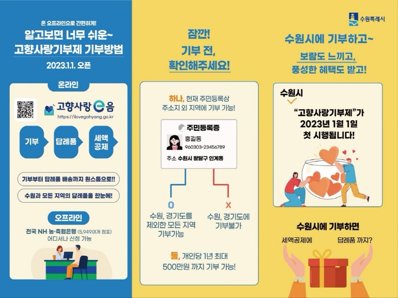 이름은 ‘고향사랑 기부제’이지만 고향에만 기부할 수 있는 건 아니다. 수원시민을 제외한 모든 지자체 시민이 수원시에 기부할 수 있고, 수원시민은 수원시와 경기도를 제외한 전국 모든 기초·광역 지자체에 기부할 수 있다. 온라인(고향사랑e음시스템), NH농협은행 접수창구에서 기부를 신청할 수 있다.