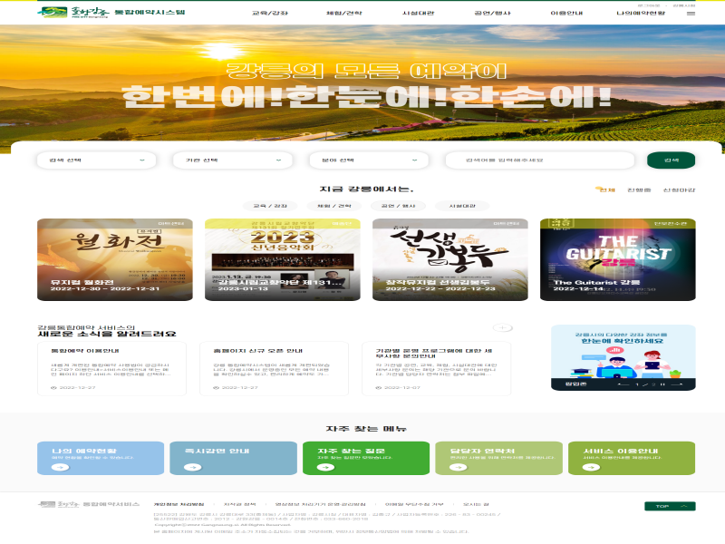 강릉시는 교육·강좌, 체험·견학, 시설대관, 공연·행사 등 다양한 공공서비스의 확인과 사전 예약이 가능한 통합예약시스템을 전면 개편하여 2일(월)부터 시청 홈페이지에서 새롭게 서비스를 시작한다.