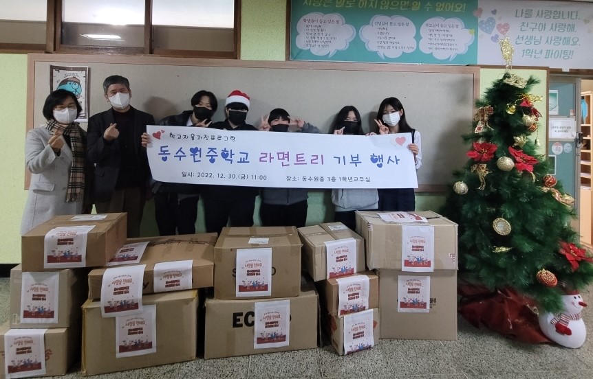 지난 12월 30일 동수원중학교 1, 3학년 학생들이 라면트리 행사로 모은 라면 800여 개를 어려운 이웃에게 나누어 달라며 매탄1동 행정복지센터에 기부했다.