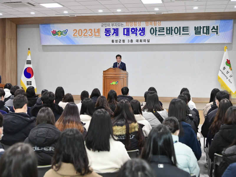 횡성군은 1월 4일 오전 9시 30분, 군청 3층 대회의실에서 2023년 동계 대학생 아르바이트 발대식을 가졌다.