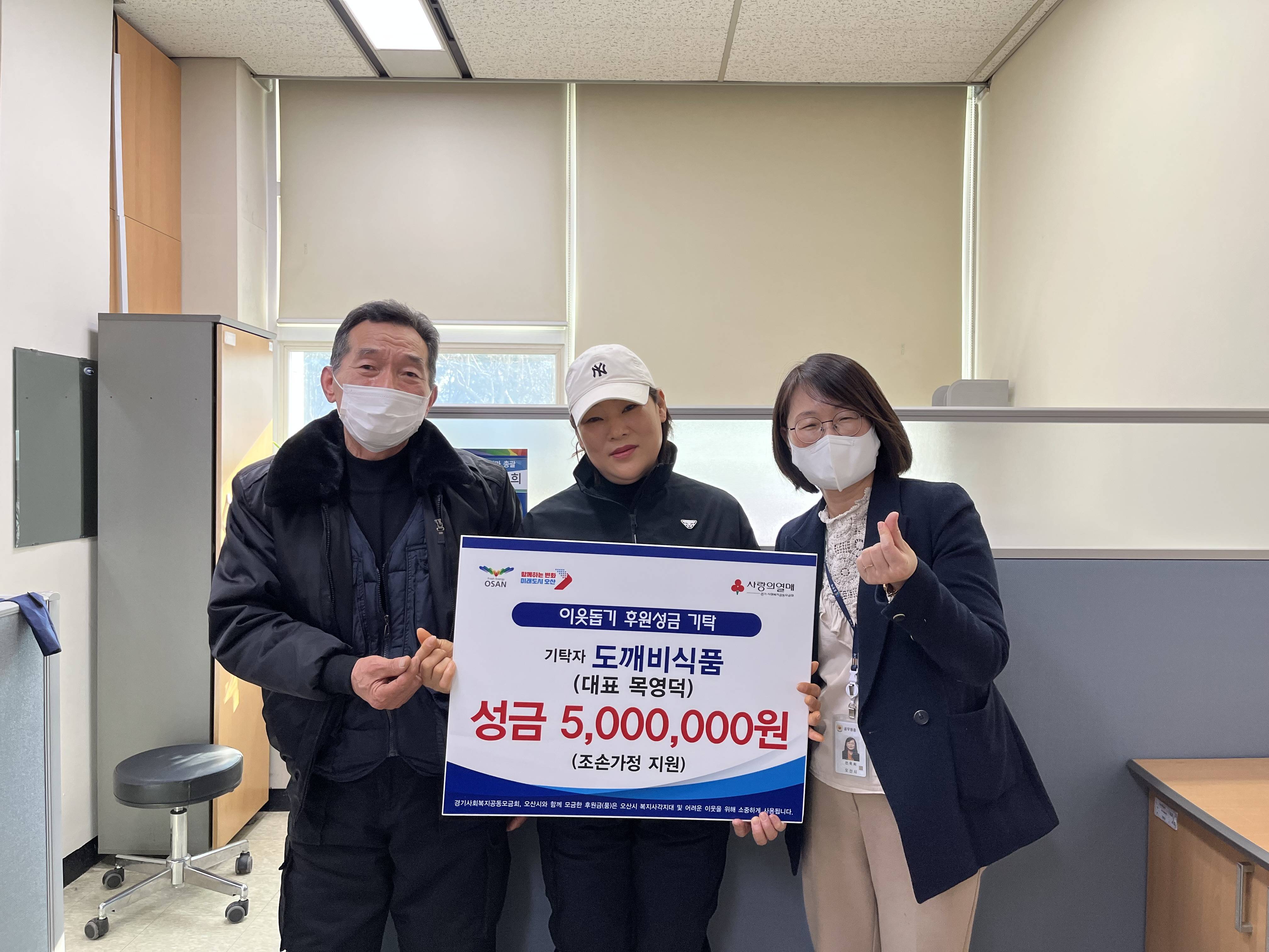 오산시(시장 이권재)는 지난 4일 오산동에 소재한 도깨비식품에서 조손가정에 써달라며 후원 성금 500만원을 기탁했다고 밝혔다.