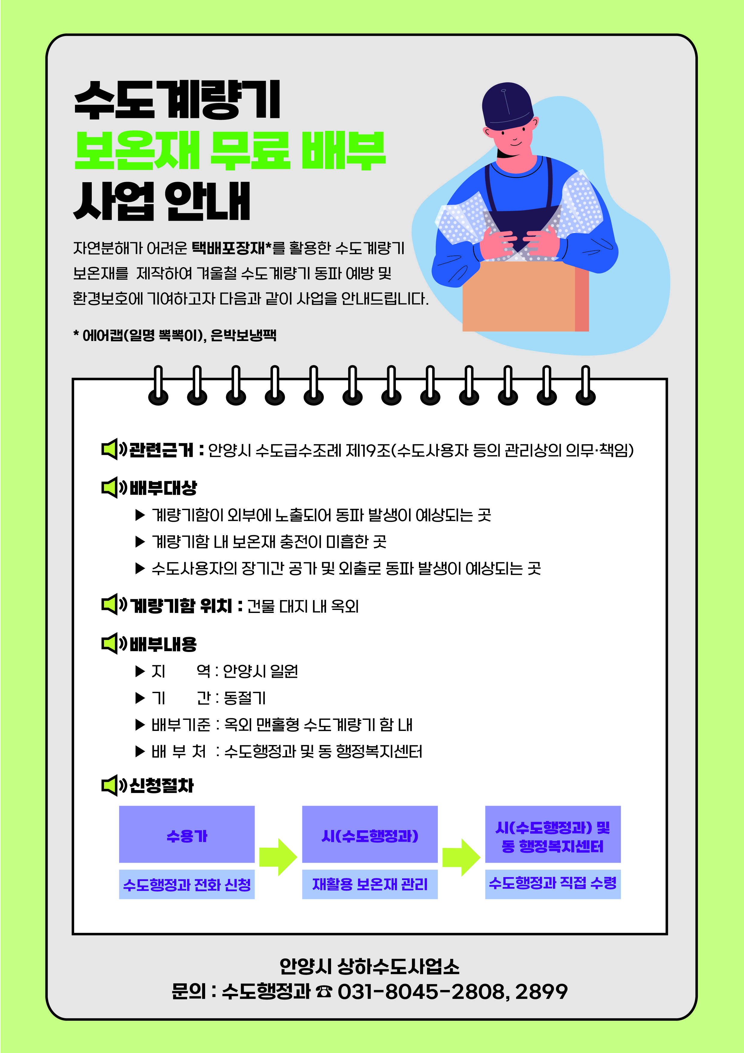 안양시가 기후변화의 잦은 한파로 급증하는 수도계량기 동파 사고와 비대면시대 택배서비스 이용 증가로 버려지는 택배포장재의 환경 문제 해결에 나선다.안양시는 ‘택배포장재를 활용한 수도계량기 동파 예방 시범사업(수도계량기 동파 예방사업)’을 추진한다고 5일 밝혔다.