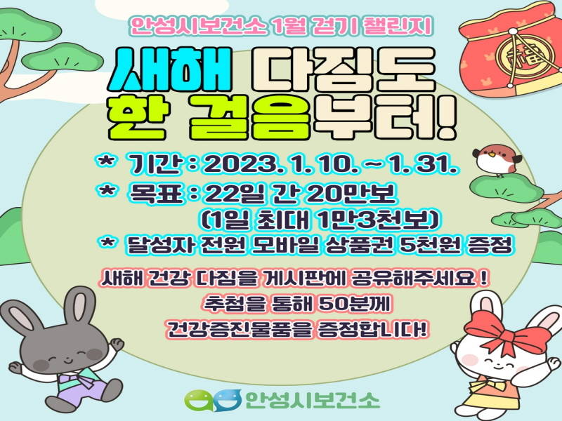 걷기 챌린지 관련 자세한 사항은 안성시보건소 건강증진과 건강증진팀(☏031-678-5756)으로 문의하면 된다.
