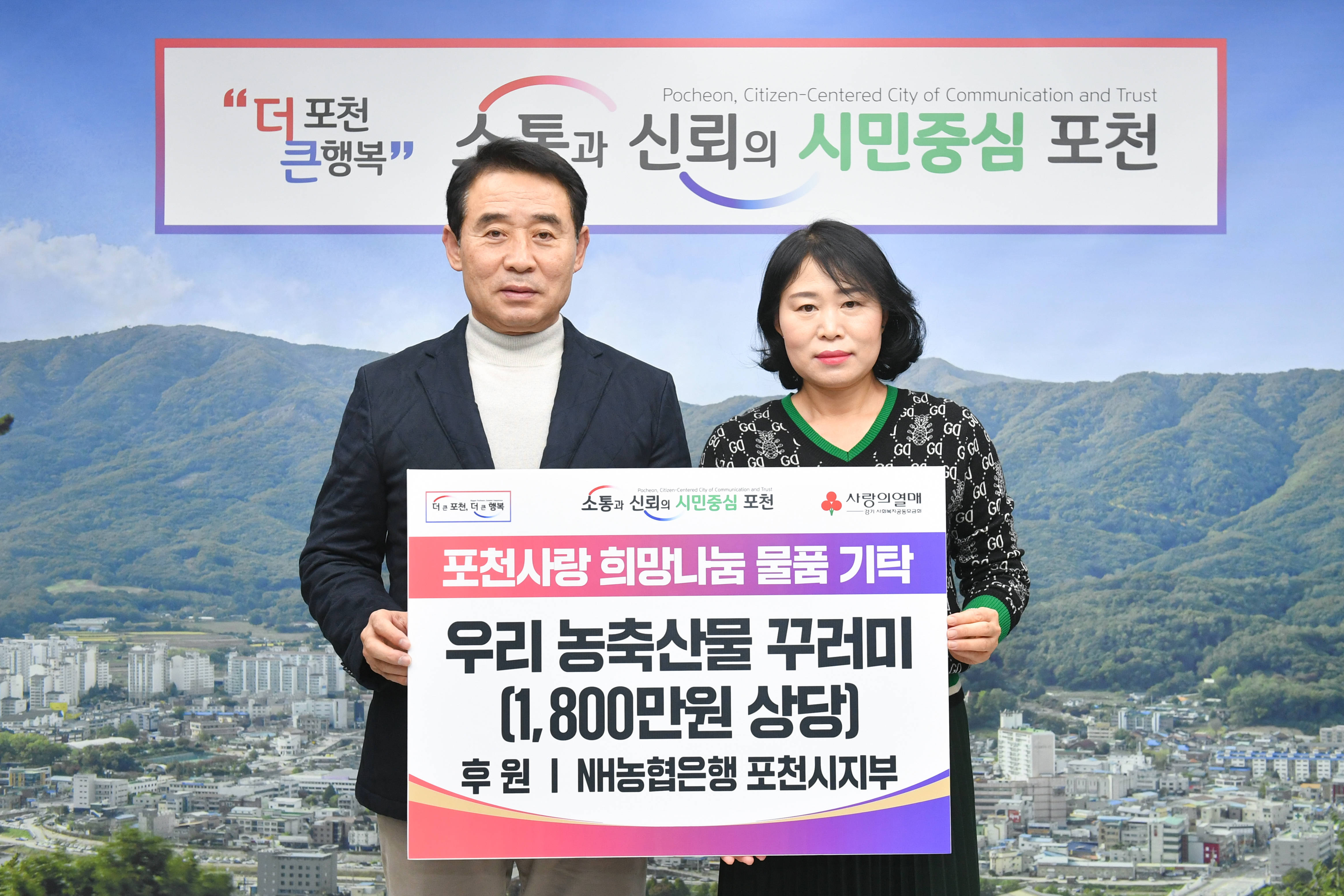 포천시는 지난 6일 NH농협은행 포천시지부(지부장 박윤경)가 경기사회복지공동모금회를 통해 1,800만 원 상당의 우리 농축산물 꾸러미 300세트를 취약계층 지원을 위해 기탁했다고 밝혔다.