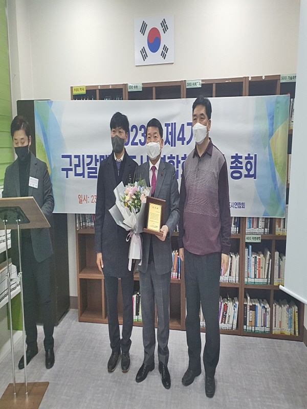 □ 백경현 구리시장은 지난 8일 갈매한라비발디 작은도서관에서 열린 ‘2023년 제4기 구리갈매신도시 연합회 정기 총회’에서 감사패를 수상했다.