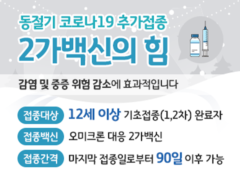 코로나19 동절기 추가접종은 오미크론 변이 대응 2가 백신이며, 질병관리청의 접종효과 분석 결과 기존 백신에 비해 감염위험 최대 56% 감소 및 중증화 예방 효과 76.6%, 사망예방효과 80.5%로 동절기 추가접종의 중요성이 확인됐다.