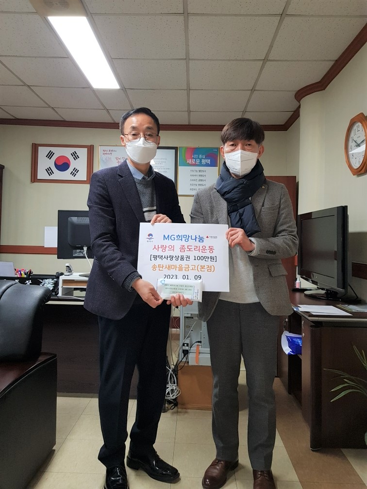 송탄새마을금고가 지난 9일 행복나눔 ‘사랑의 좀도리 운동’으로 평택시 신장2동 행정복지센터에 평택사랑상품권(100만원)을 기탁했다.‘사랑의 좀도리 운동’은 올해로 25년째 진행되고 있는 새마을금고의 모금·나눔 캠페인으로, 새마을금고 회원이 십시일반으로 모은 소중한 마음을 연말연시 따뜻한 나눔을 통해 어려운 이웃에게 전하며 지역사회와 상생하는 사회공헌 활동이다.