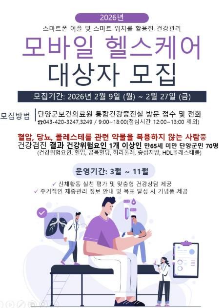 한방통신사 권영분기자 기자 | 단양군은 군민의 만성질환 예방과 건강생활 실천을 지원하기 위해 ‘2026년 모바일 헬스케어 사업’ 대상자를 오는 27일까지 모집한다.