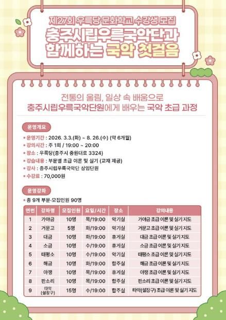 한방통신사 권영분기자 기자 | 충주시립우륵국악단은 ‘제27회 우륵당 문화학교’를 오는 3월부터 8월까지 약 6개월 간 운영한다고 19일 밝혔다.