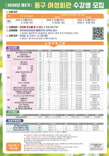 한방통신사 신유철기자 기자 | 인천 동구는 오는 3월 9일~4월 3일까지‘2026년 제2기 동구 여성회관’ 수강생을 모집한다고 밝혔다.