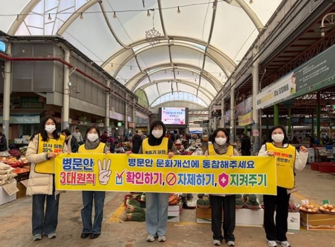 특히 설 연휴를 앞둔 2월 11일 광양읍 5일시장 일원에서 보건소 직원 5명이 참여해 병문안 문화개선 캠페인을 펼치며, 시민들에게 병문안 문화 개선 3대 원칙인 ▲확인하기(병문안 가능 시간과 장소 확인) ▲자제하기(환자를 위해 병실 면회 자제) ▲지켜주기(손 위생, 기침 예절 등 예방수칙 준수)의 실천을 안내했다.