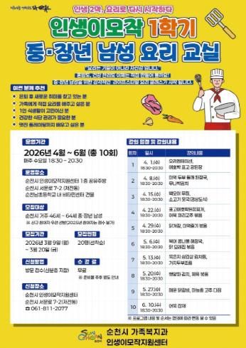 한방통신사 신다은기자 기자 | 순천시는 중·장년 남성의 건강한 식생활 형성과 활기찬 인생 2막 준비를 지원하기 위해 ‘중·장년 남성 요리교실’ 수강생을 모집한다고 밝혔다.