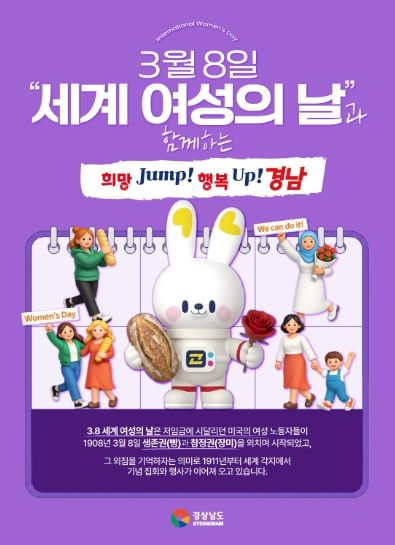 한방통신사 신유철기자 기자 | 경상남도는 3월 8일 세계 여성의 날을 맞아 여성의 사회 참여 확대와 양성평등 사회 실현을 위한 다양한 정책을 추진하고 있다고 밝혔다.