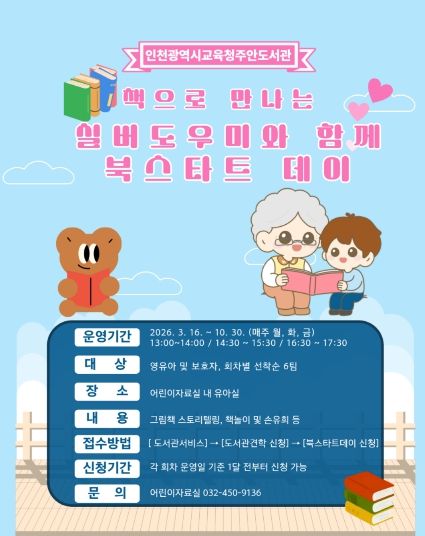 한방통신사 신유철기자 기자 | 인천광역시교육청주안도서관은 오는 3월 16일부터 10월 30일까지 영유아 및 보호자를 대상으로 ‘책으로 만나는 실버도우미와 함께 북스타트 데이’를 운영한다.