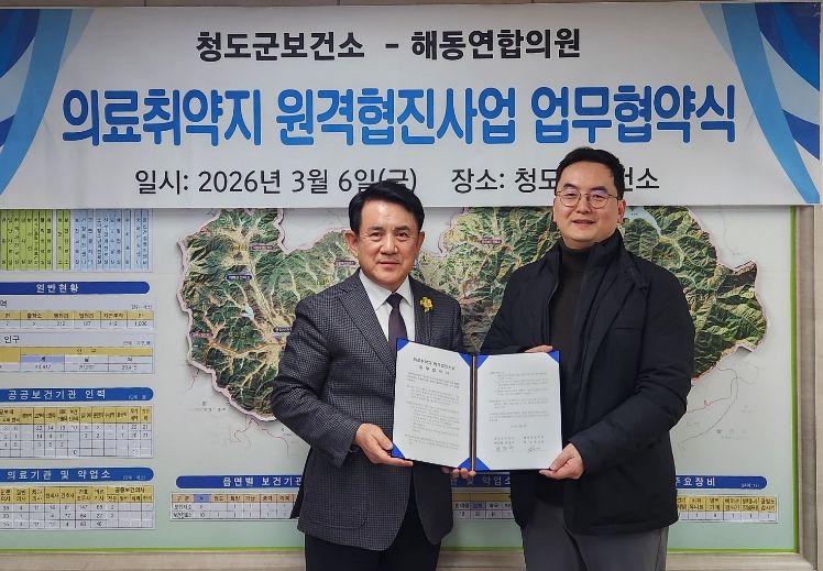 한방통신사 신유철기자 기자 | 청도군은 지난 3월 6일 해동연합의원(원장 현상헌)을 의료취약지 원격협진사업 협력 의료기관으로 지정하고 사업 추진을 위한 업무협약(MOU)을 체결했다. 이번 협약은 의료취약지역 주민의 의료접근성을 높이고 전문의 자문을 통한 체계적인 건강관리를 지원하기 위해 마련됐다.