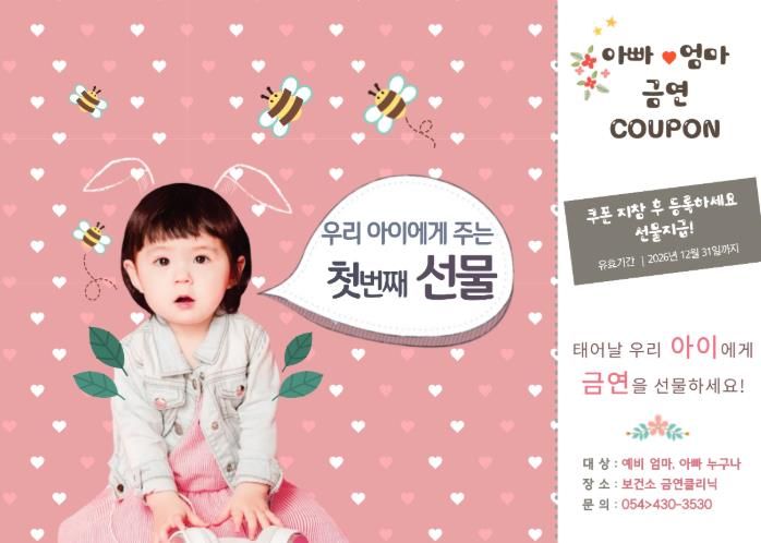 김천시보건소 건강증진과장은 “보건소를 방문하는 임산부와 가임기 부부가 등록권을 통해 태아 건강의 중요성을 다시 한번 인식하는 계기가 되기를 바란다.”라며, “태어날 아이에게 금연을 선물한다는 마음으로 보건소 금연클리닉을 적극적으로 활용해 주시길 바란다.”라고 말했다.