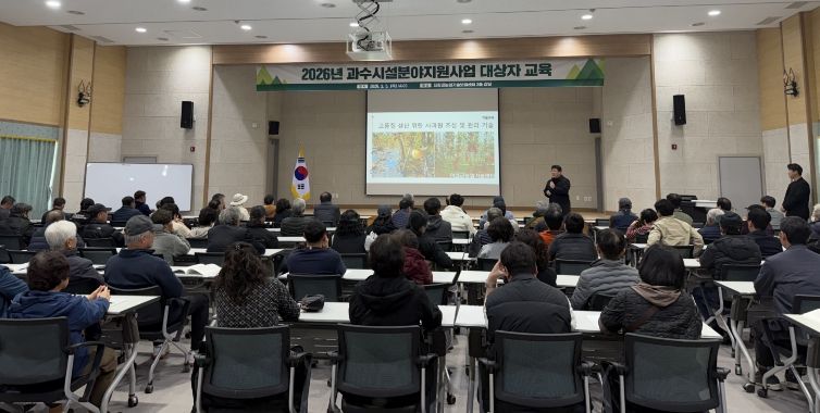 이날 교육에는 ▲2026년 FTA과수고품질시설현대화사업 품종갱신 사업대상자 ▲2026년 경북형 평면사과원 조성사업 대상자 ▲2026년 과수재해예방시설 품종갱신 사업대상자 등 총 100여 명이 참석했다.