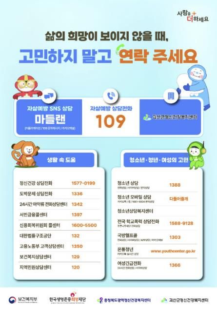 주요 추진 내용은 △자살예방 상담전화 109 △자살예방 캠페인 운영 △생명지킴이 양성교육 △찾아가는 심리지원서비스 △생명사랑안심마을 조성 등이다.