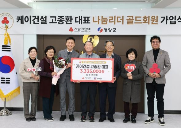 케이건설 고종환 대표는 2024년 결혼 33주년을 맞아 333만 3천 원을 기부하며 지역사회 나눔에 동참했으며, 이후 매년 결혼기념일마다 1천 원씩 증액해 기부를 이어오고 있다. 이번 나눔리더 골드회원 가입을 통해 지역사회 어려운 이웃을 위한 나눔 실천을 지속해 나갈 예정이다.