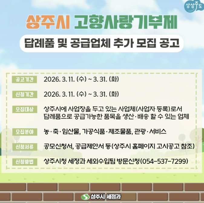 한방통신사 신유철기자 기자 | 상주시는 고향사랑기부제 활성화와 지역경제 발전을 위해 고향사랑기부제 답례품 및 공급업체를 추가 모집한다.
