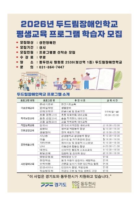 한방통신사 신유철기자 기자 | 동두천시가 장애인 평생교육 진흥을 위해 지원하고 있는 두드림장애인학교가 2026학년도 평생교육 프로그램 학습자를 모집한다.