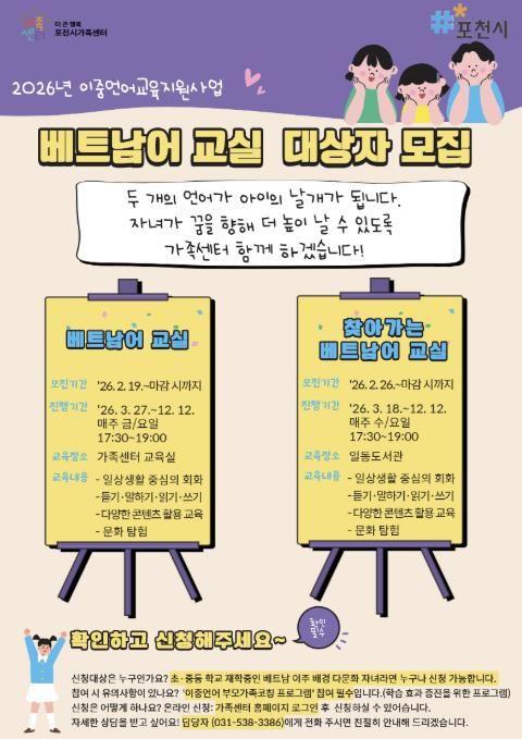한방통신사 신유철기자 기자 | 포천시 직영 ‘더 큰 행복 포천시가족센터’는 다문화 자녀의 이중언어 역량 강화를 위한 2026년 이중언어 교육지원사업 베트남 교실 수강생을 모집한다.
