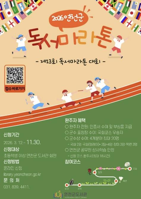 참가 대상은 초등학생 이상 연천군 도서관 회원으로, 연천군 도서관 홈페이지에서 신청할 수 있다. 독서마라톤은 책 1페이지를 1m로 환산해 정해진 거리를 완주하는 방식이다. 참가자는 씨앗(3km), 새싹(5km), 목련(10km), 장미(21.1km), 국화(42.195km) 등 5개 코스 중에서 자신의 독서량에 맞는 코스를 선택하면 된다.
