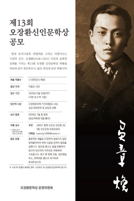 한방통신사 권영분기자 기자 | 충북 보은군과 오장환 문학상 운영위원회는 한국 모더니즘과 리얼리즘, 아방가르드 시단의 선구자로 평가받는 오장환(1918~1951) 시인의 문학 정신을 기리고 유망한 신인 시인을 발굴하기 위해 ‘제13회 오장환 신인문학상’ 작품을 공모한다.
