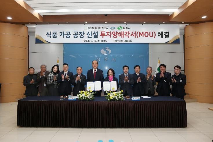 한방통신사 신유철기자 기자 | 주식회사 더동쪽바다가는길과 상주시는 2026년 3월 16일 오전 10시, 상주시청 대회의실에서 상주 일반산업단지 내 수산물 가공식품 제조공장 신설을 내용으로 하는 투자양해각서를 체결했다.