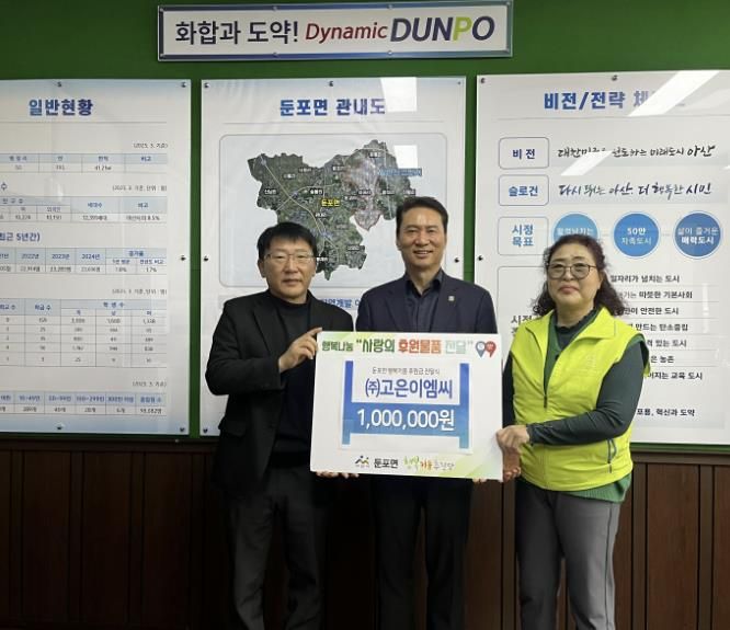 한방통신사 신태공 기자 | ㈜고은이엠씨는 지난 17일 아산시 둔포면 행복키움추진단을 찾아 어려운 이웃을 위한 후원금 100만 원을 전달했다.