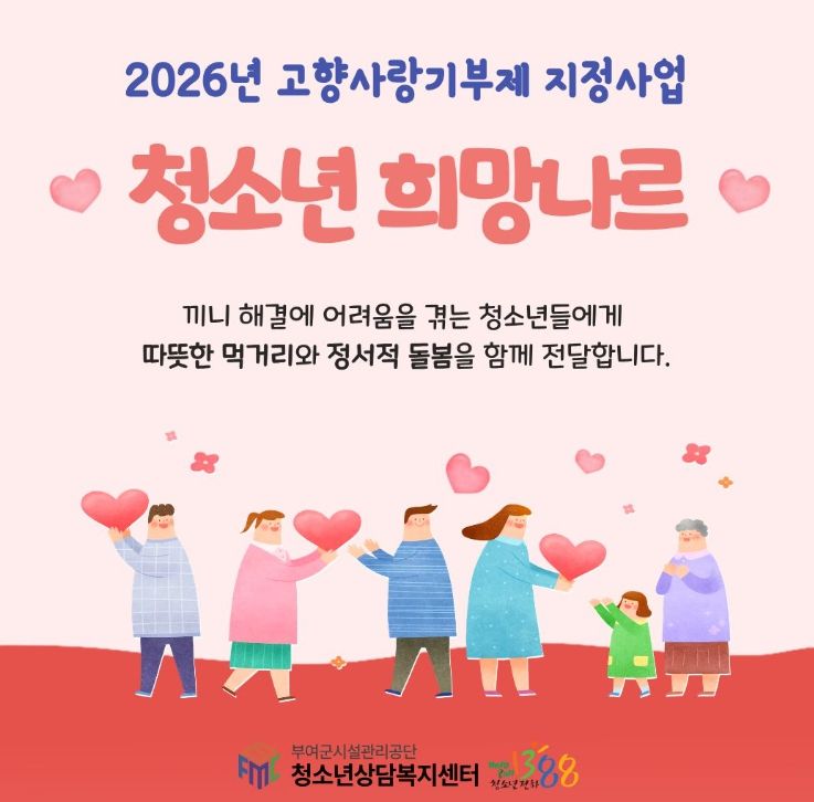 한방통신사 신태공 기자 | 부여군시설관리공단 부여군청소년상담복지센터는 지역사회 기부금을 활용하여 돌봄 사각지대 청소년을 지원하는 고향사랑기부제 지정사업 '청소년 희망나르'를 추진한다고 밝혔다.