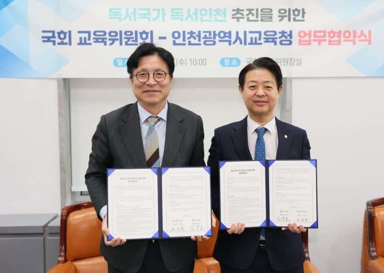 양 기관은 이번 협약에 따라 인천시교육청의 독서 정책을 생애주기별 독서교육 모델로 확산하고, 국회 차원의 입법·제도적 지원과 교육청의 현장 실행력을 연계해 ‘독서국가 교육 대전환 프로젝트’의 실행 기반을 함께 다져나가기로 했다.