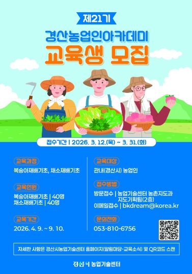 한방통신사 신유철기자 기자 | 경산시는 제21기 경산 농업인 아카데미(복숭아 재배 기초, 채소 재배 기초) 교육생(과정별 40명)을 31일까지 모집한다.