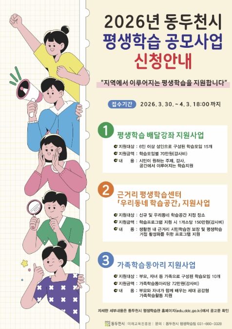 한방통신사 신유철기자 기자 | 동두천시는 시민들의 자발적인 학습 문화를 확산하고 지역 평생학습 공동체를 활성화하기 위해 ‘2026년 평생학습 공모사업’ 신청을 오는 3월 30일부터 4월 3일까지 접수한다고 밝혔다.
