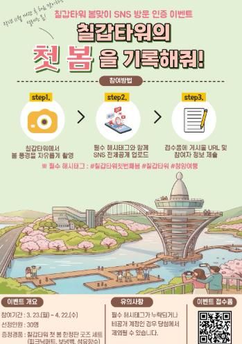 봄꽃 개화 시기에 맞춰 칠갑타워를 찾은 방문객들은 전망대에서 연둣빛으로 물든 칠갑산과 화사한 벚꽃 등 청양의 대표적인 봄 풍경을 조망하고, 이를 사진으로 기록하며 자연스럽게 이벤트에 참여할 수 있다.