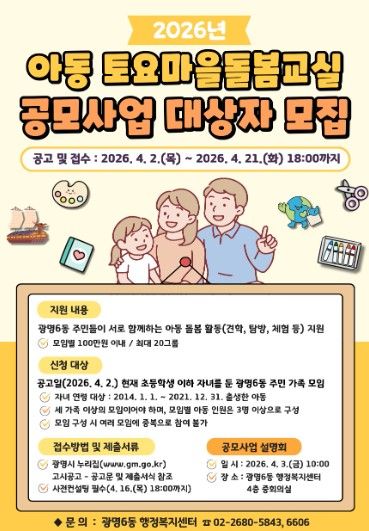 한방통신사 신유철기자 기자 | 광명시 광명6동 행정복지센터는 오는 21일까지 ‘2026년 아동 토요마을돌봄교실 공모사업’에 참여할 주민 가족 모임 20개 팀을 모집한다.