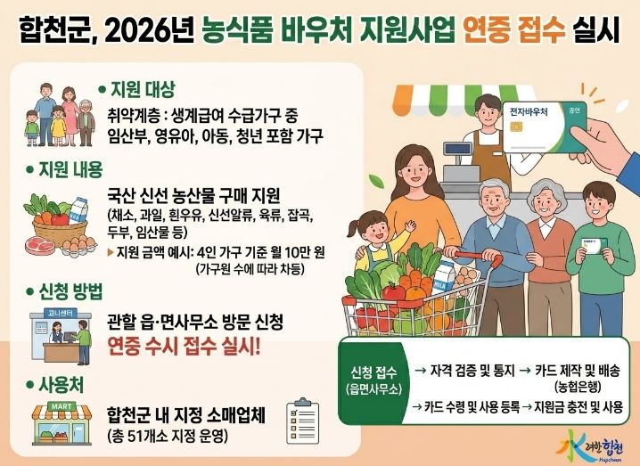 한방통신사 신유철기자 기자 | 합천군은 취약계층이 신선한 농산물을 쉽게 맛보고 건강한 식생활을 누릴 수 있도록 ‘2026년 농식품 바우처 지원사업’을 연중 추진하고 있다고 2일 밝혔다.