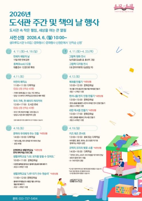 한방통신사 양호선기자 기자 | 원주시 샘마루도서관은 ‘도서관 주간 및 책의 날’을 기념해 4월 11일부터 23일까지 작가 강연, 공연, 체험, 전시 등으로 구성된 다양한 문화 행사를 개최한다.