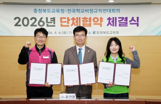 한방통신사 권영분기자 기자 | 충청북도교육청과 전국학교비정규직연대회의'전국공공운수노조 전국교육공무직본부, 전국학교비정규직노동조합'는 6일, 충북교육청 회의실에서 2026년 단체협약을 체결했다.